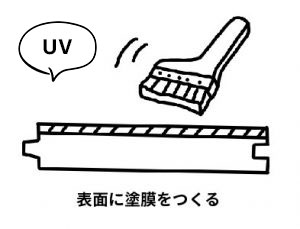 UVウレタン塗装は無垢フローリングにウレタン塗料を塗布した後、UV(紫外線)を照射して硬化しています。表面に膜が形成されているため傷がつきにくく水分が浸透しにくいという特徴も。