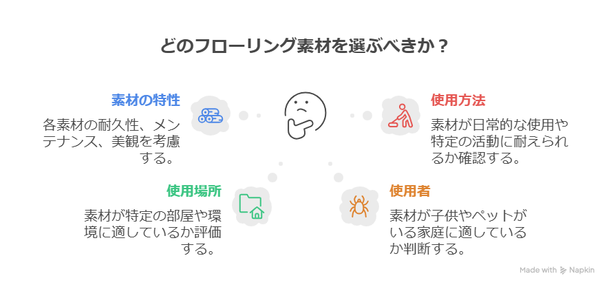 フローリングを選ぶ際には、それぞれの素材が持つ特性だけでなく、「どこで、誰が、どのように使うのか」といった視点もとても重要です。以下に、それぞれの注意点と、後悔しないための選び方のコツを詳しくご紹介します。