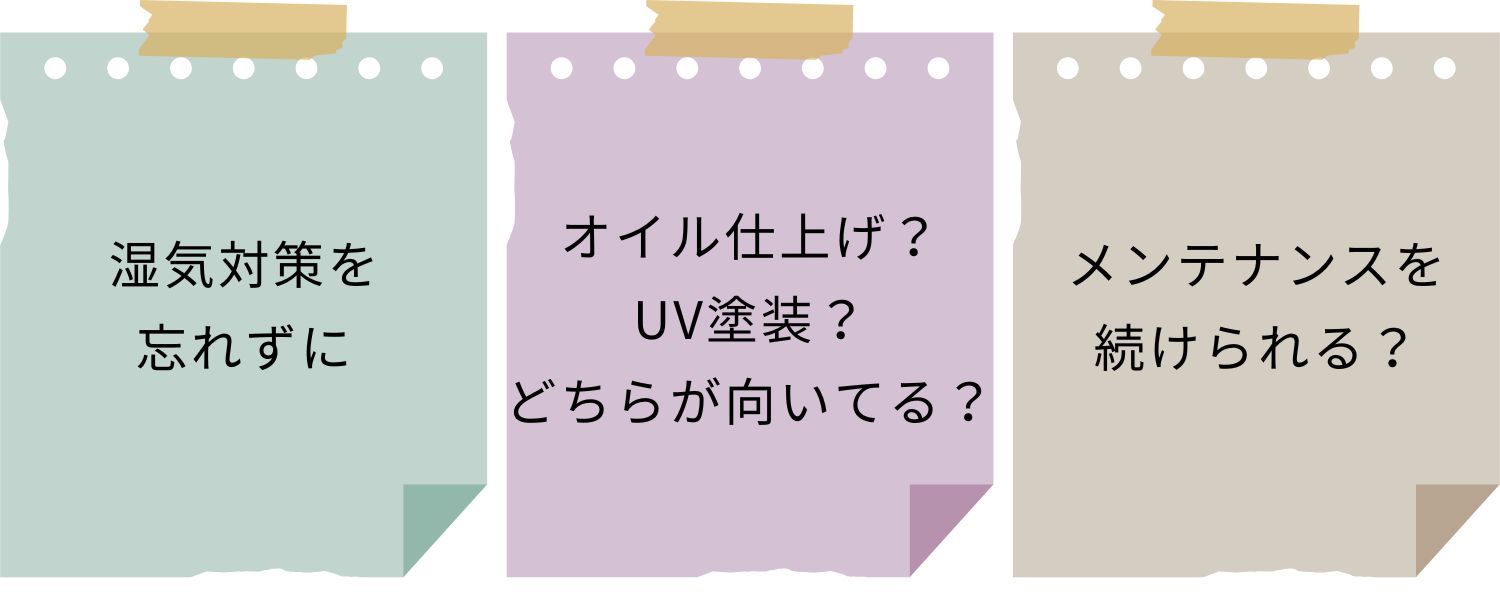 オイル仕上げはワックスがけや傷の補修など、メンテナンスに時間をかけられるかも選定のポイントです。メンテナンスはしない!と最初から腹をくくる強者も中にはいますが、長く美しく使っていただくにはメンテナンスは欠かせません。年に1度は家族みんなでメンテナンスDAYを楽しむのも良いですよね。