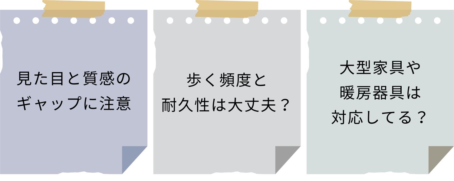 素材の特性上、重い物を長い間置いているとへこんでしまいます。冷蔵庫や大型家具などを配置する場合は動かさないことを前提に配置が決めた方が良さそうですね。また、熱に弱いためホットカーペットやヒーターを使用する際にも変色に注意が必要です。熱対応タイプであるかどうか確認しましょう。