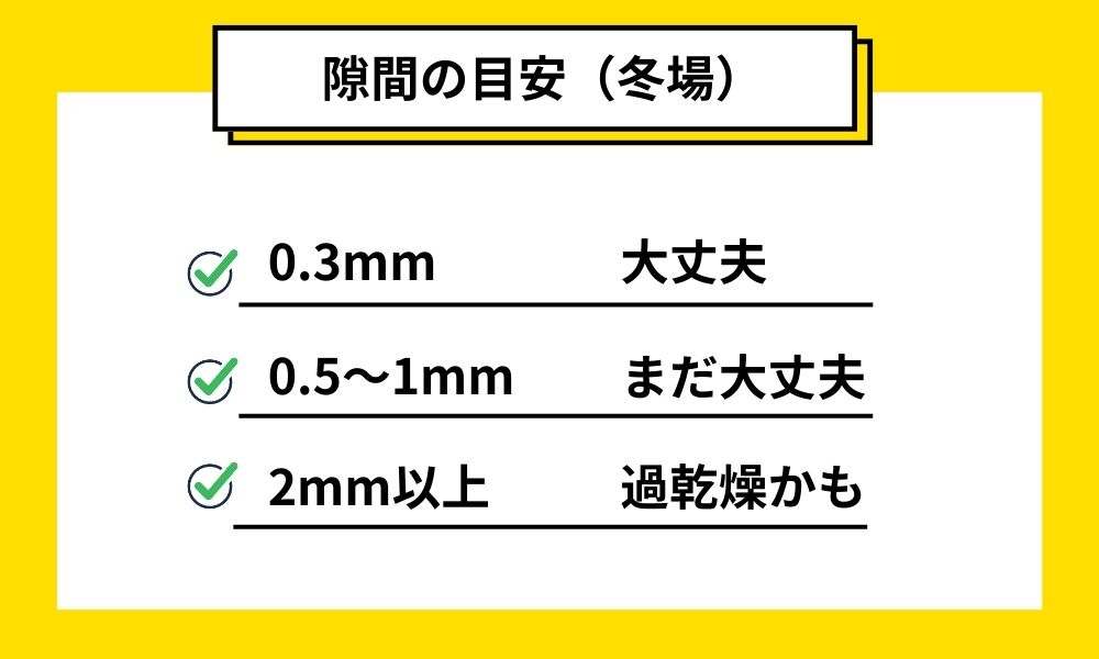 木材の種類や幅、室内環境によっても変わりますが、冬場に1mm前後のすき間が見えること自体は、特別な異常とは言えないケースが多いです。