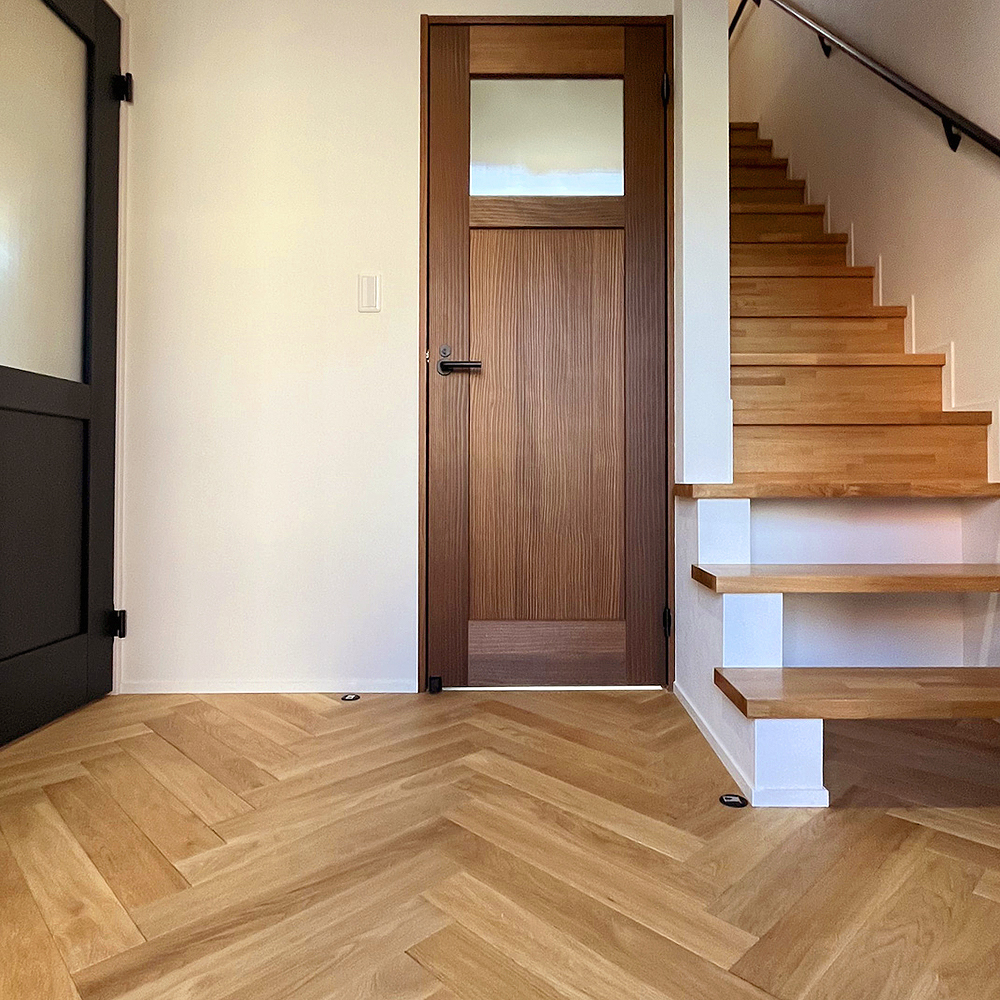 玄関をヘリンボーンにしたのも好評ですし、1Fをオーク材、2Fをアカシア材にしたのも違った雰囲気が楽しめてとても気に入っております。